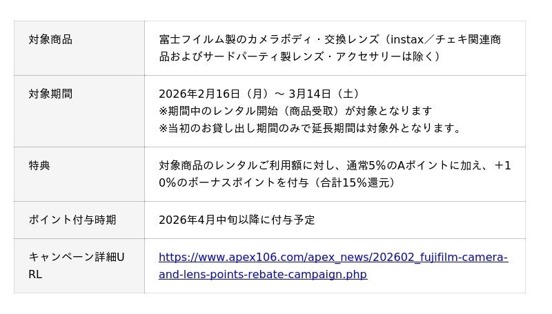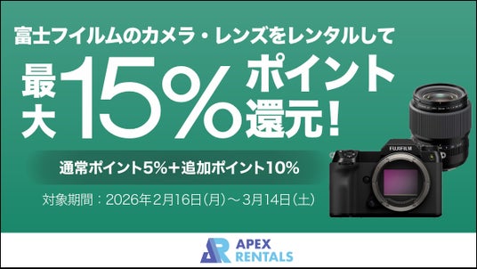 デジタルカメラ、交換レンズなどのレンタルサービス「APEX RENTALS」を手がける株式会社ビデオエイペックス(本社:東京都中央区日本橋蛎殻町1-7-9オンラインビル1F 代表取締役:片山洋平、以下:弊社)は、2026年2月16日(月)より『富士フイルム製カメラ・レンズ 15%ポイント還元キャンペーン』を期間限定で開催します。