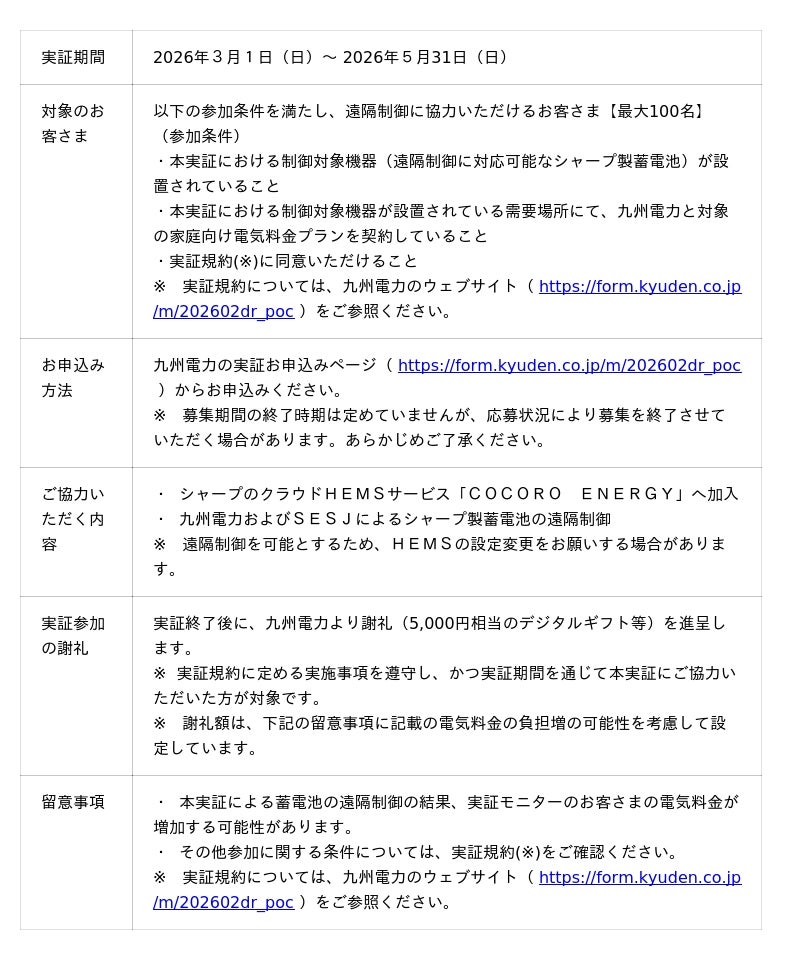 なお、実証開始に先立ち、シャープ製蓄電池を保有されているお客さまを対象に、本日2月17日から実証モニターの募集を開始します。ご協力いただけるお客さまは、こちら( https://form.kyuden.co.jp/m/202602dr_poc )からお申込みください。(詳細は実証概要を参照)