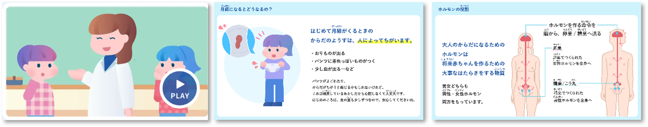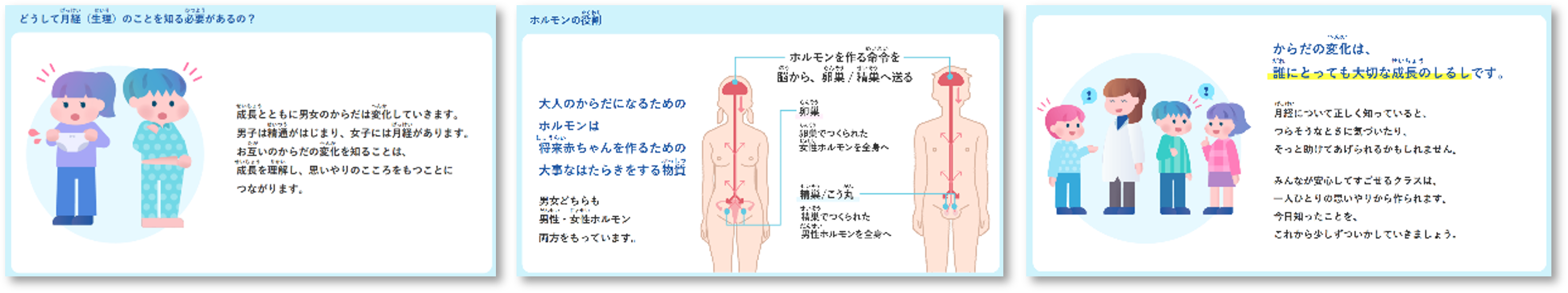 女子だけでなく男子も「パートナーや家族のこと」として捉えられるよう、男女のからだの違いや生理の仕組みを解説する教材を用意しました。