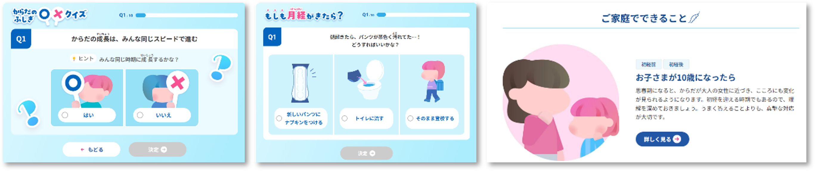 シミュレーションで「もしも生理がきたら?」や、クイズを通じた知識伝達だけでなく、子どもたちが自ら考え、対話するきっかけを提供します。
