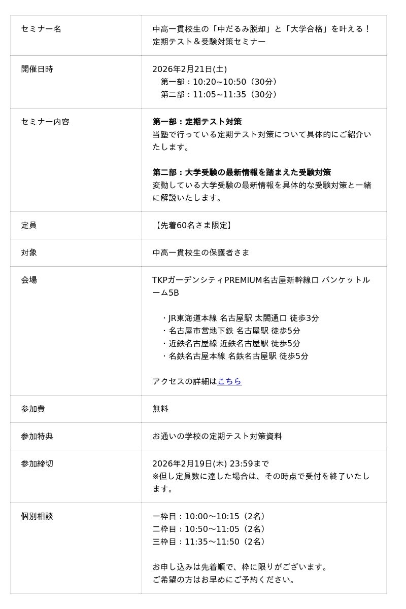 中高一貫校専門 個別指導塾WAYS(運営:株式会社メイツ、本社:東京都新宿区)は、2026年2月21日(土)、TKPガーデンシティPREMIUM名古屋新幹線口にて、中高一貫校に通う中学生・高校生の保護者様を対象とした『中高一貫校生の「中だるみ脱却」と「大学合格」を叶える!定期テスト&受験対策セミナー』を開催いたします。