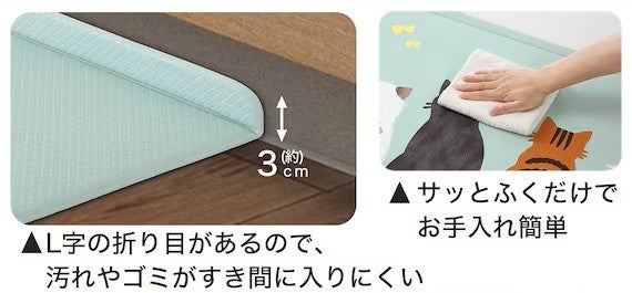 キッチンマットと床のすき間に入り込むゴミは、掻き出したり吸い取ったりと手間がかかりがちです。本商品は、高さ約3cmのL字の折り目を設けることで、汚れやゴミがすき間に入りにくく、キッチンマット表面を拭き取るだけでお手入れしやすい構造となっています。