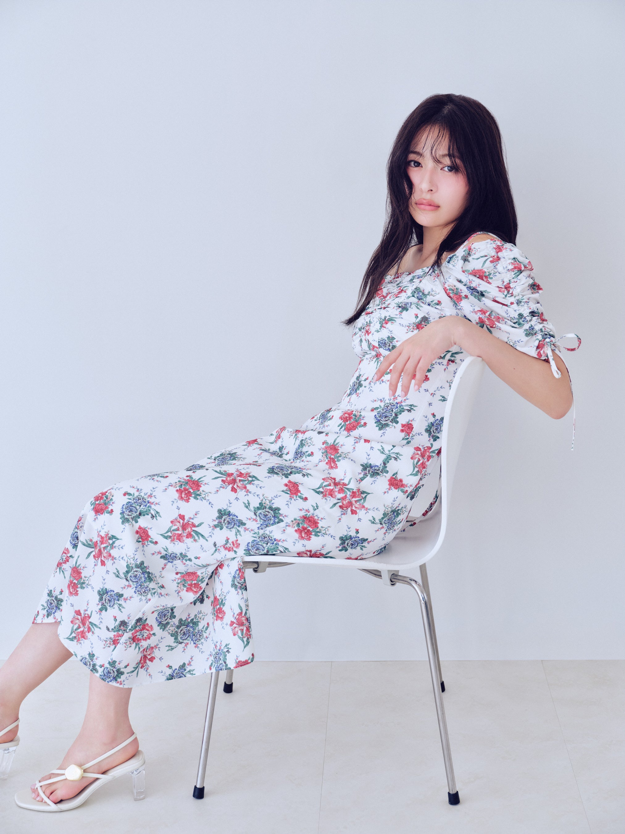 華やかなローズ柄が印象的なフラワープリントオフショルワンピース。