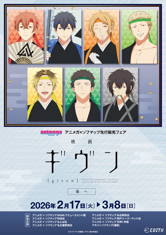 IPを活用したイベント事業・グッズ事業を手掛ける株式会社イーディス(本社:東京都豊島区、代表取締役:森俊平、以下イーディス)は、『映画 ギヴン 海へ』の描き下ろしイラストを使用した商品を2026年2月17日よりアニメガ×ソフマップにて先行販売いたします。