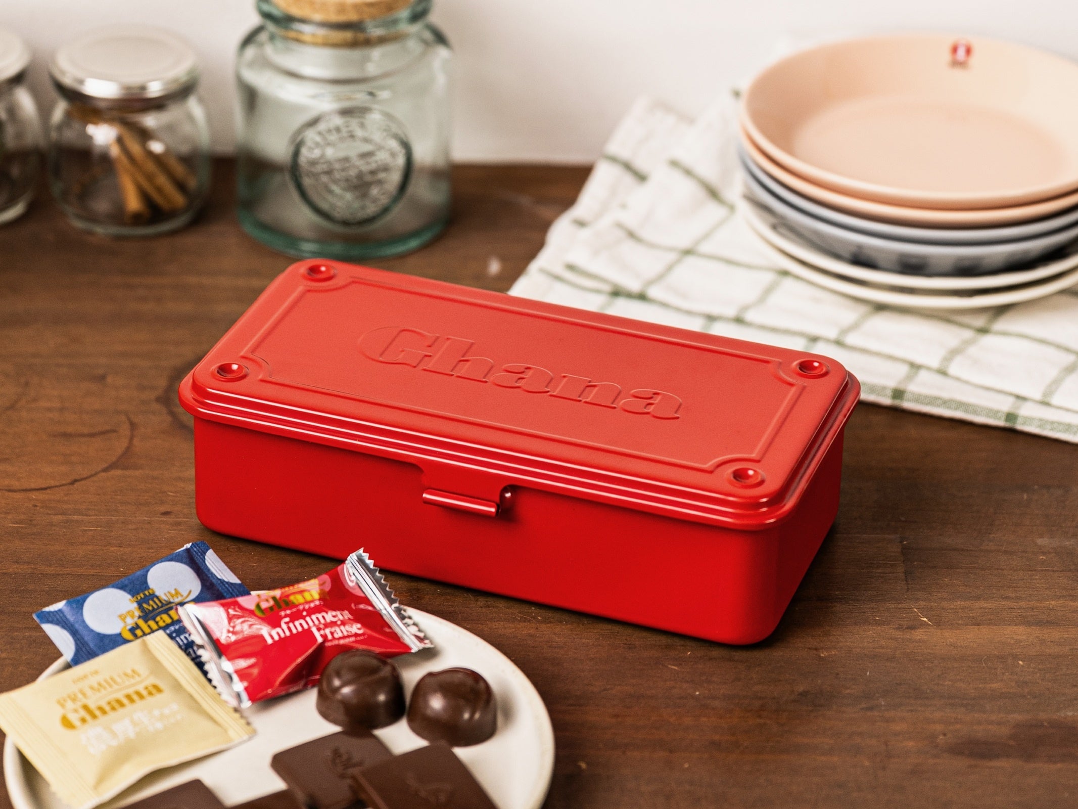 東洋スチールが誇る堅牢なスチールボックスに、ガーナのブランドアイデンティティを象徴する鮮やかなレッドを纏わせ、蓋には誇り高く『Ghana』の文字を刻印しました。