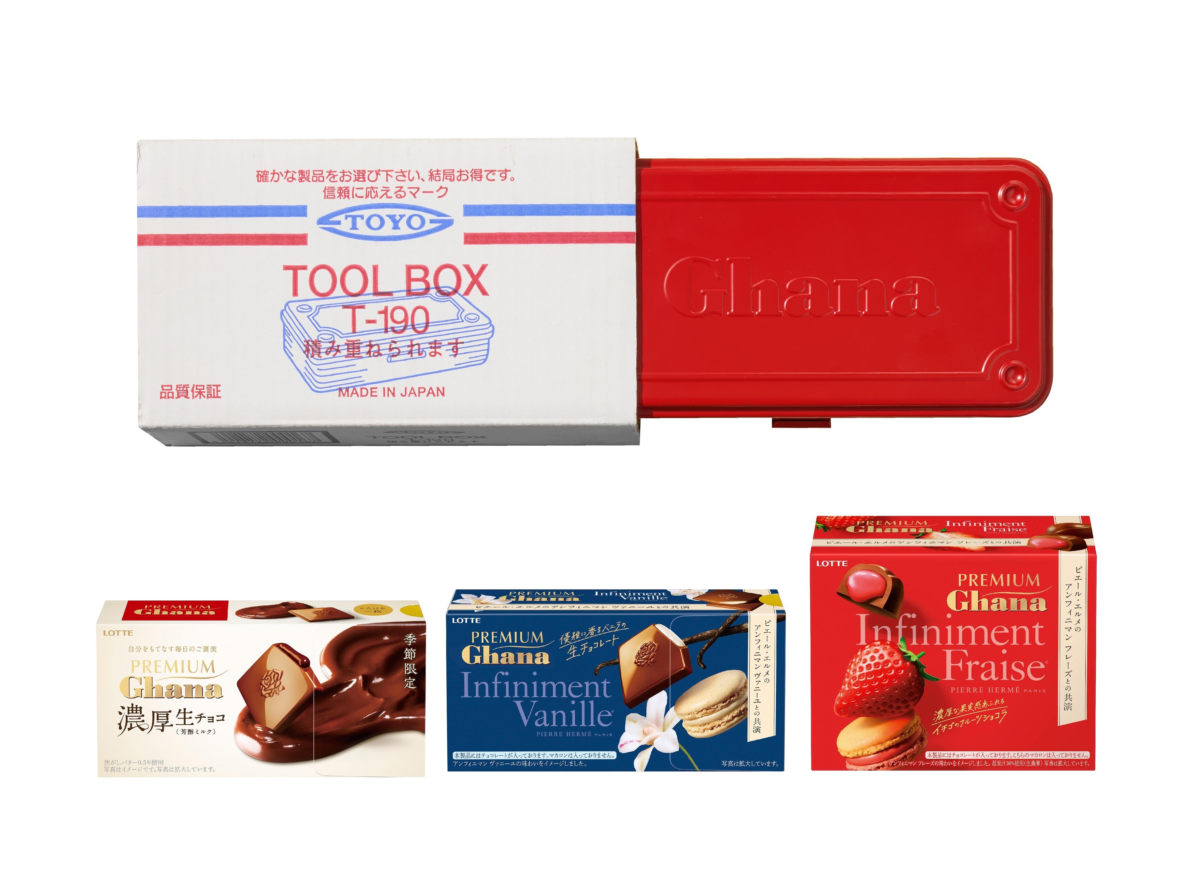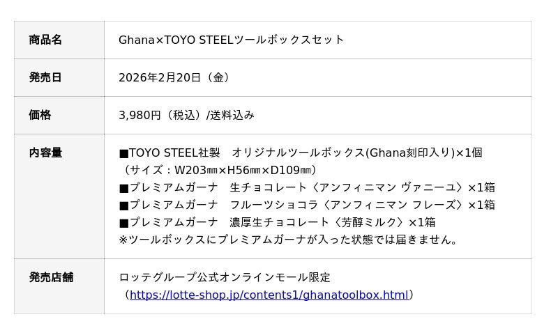 株式会社ロッテ(東京都新宿区、代表取締役社長執行役員:中島英樹、以下ロッテ)は、とろけるくちどけのチョコレート「ガーナ」ブランドより、継ぎ目のないスチール製ツールボックス製造の先駆者である、東洋スチール株式会社(大阪府東大阪市、代表取締役:久司泰二)とコラボレーションした、「Ghana×TOYO STEELツールボックスセット」を、2026年2月20日(金)10時より、ロッテグループ公式オンラインモールにて販売を開始いたします。