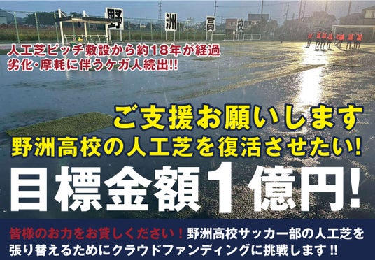 野洲高校サッカー部が平成17年(2005年)の第84回全国高校サッカー選手権大会で県勢初の優勝を飾った後に、整備されたサッカー場の人工芝が、敷設から約18年が経過し、パイルの摩耗や劣化が激しい状態となり、安心安全な環境での活動が出来なくなりつつあります。