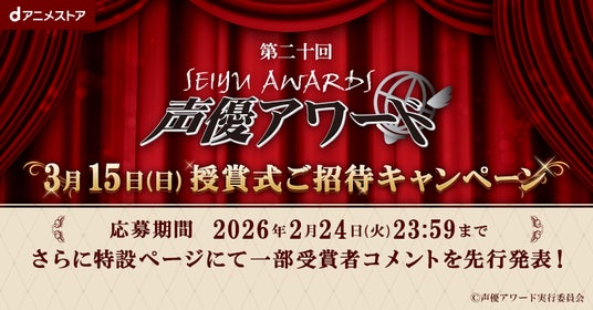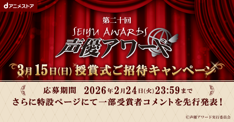 国内最大級(※1)の7,200作品以上のアニメが見放題(※2)の「dアニメストア」( https://animestore.docomo.ne.jp/ )では、2026年3月15日(日)に行われる「第二十回声優アワード 授賞式」へのご招待キャンペーンを実施いたします。