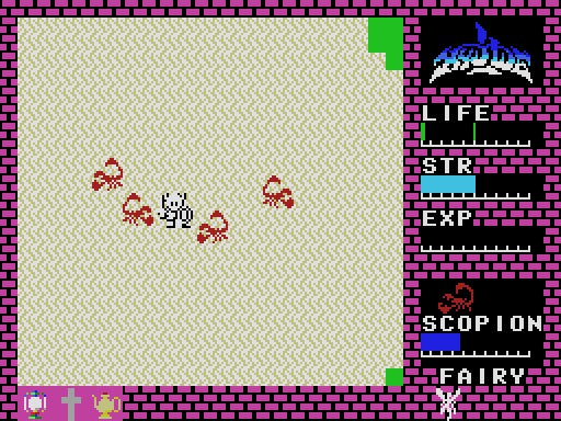 本作は1985年にリリースされたアクションRPG。プレイヤーは勇敢な若者ジムを操作して失われた宝石を取り戻し、悪魔バラリスを倒してフェリーランドの平和を取り戻すことになります。当時、アクティブRPGと称されていたことからもわかるように、本作ではアクション性がキモ。プレイヤーは攻撃モードと防御モードを切り替えながらジムをモンスターに体当たりさせて戦います。モンスターを倒せは経験値が手に入り、経験値を溜めることでジムはレベルアップしてより強くなっていきます。ちなみにジムが傷ついてしまったときは、平地などで休ませることで自動的に体力が回復する仕組みとなっています。