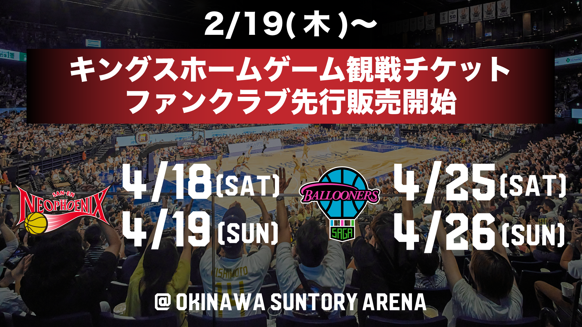 上記の計4試合の観戦チケットを2月19日(木)よりファンクラブ先行にて販売します。沖縄サントリーアリーナでレギュラーシーズン終盤戦もキングスへの多くの後押しをよろしくお願いします。