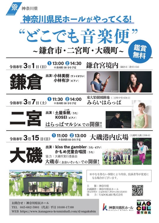 2026年3月は、鎌倉市にある明治天皇創建の神社「鎌倉宮 境内」、二宮町の「東大果樹園跡地 みらいはらっぱ」、大磯町の「大磯港内広場」の3か所にて、鑑賞無料の野外コンサート「どこでも音楽便」を開催します。