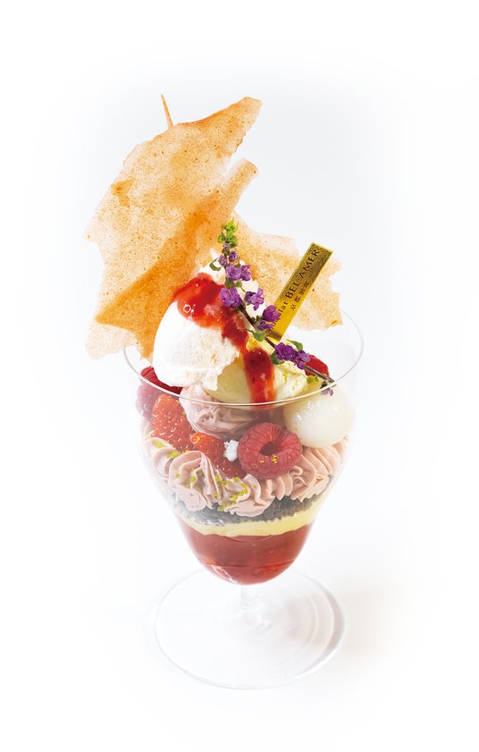 国産苺に桜の香りをまとわせたマリネ、苺のジュレ、カスタードクリーム、ショコラのクランチ、苺チョコのクリーム、白玉を重ねました。バニラアイスと桜風味のアイスに苺ソースをかけ、薄く焼き上げた桜色のチュイールと桜チョコを飾って仕上げた、春を映す華やかなパフェです。