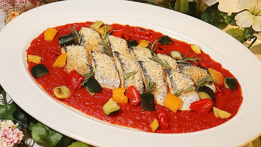 春が旬の鰆を香り豊かなハーブとサクサクのパン粉にまとわせ、春野菜と共に彩り豊かに仕上げました。