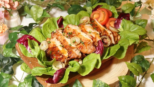 香ばしく焼きあげたチキンに春野菜を添えてボリュームたっぷりに仕上げました。ジューシーなお肉と旬の彩り食欲をそそります。
