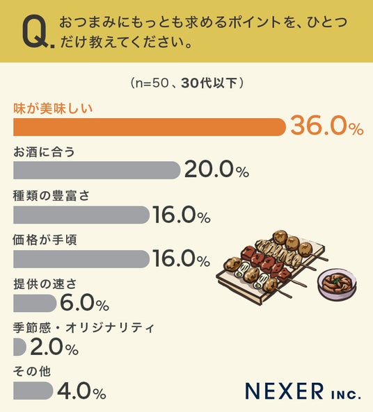 30代以下では「味が美味しい」が36.0%でトップ、「お酒に合う」が20.0%、「種類の豊富さ」と「価格が手頃」が16.0%で並んでいます。種類の豊富さへの関心が高い点が特徴的です。