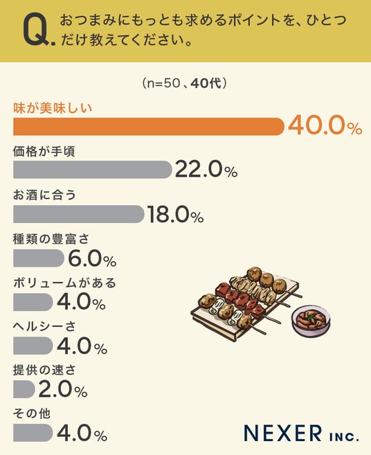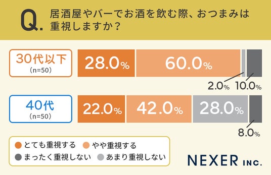 さらに「あまり重視しない」と答えた割合は、40代が28.0%で、30代以下の2.0%より大きく上回りました。40代は、おつまみよりもお酒そのものを楽しみたい人が多いのかもしれません。