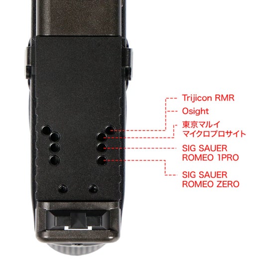 同社製マイクロプロサイトをはじめ、Trijicon RMR、Osight、ROMEO 1PRO、ROMEO ZEROおよび同規格の光学機器を搭載可能。軽量かつ高剛性のアルミ合金を採用し、スライド上へ強固に固定できます。