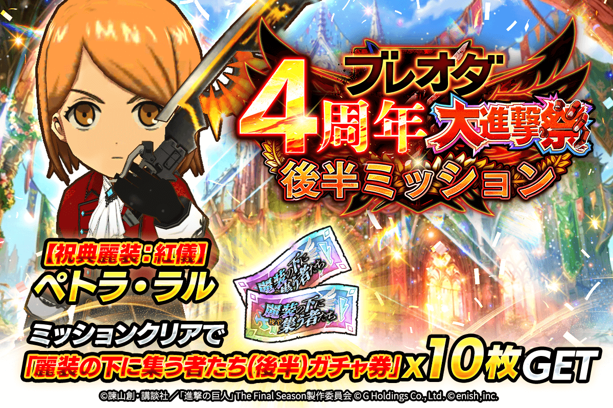 株式会社enish(本社:東京都港区、代表取締役社長:安徳 孝平、以下enish)は、アニメ『進撃の巨人』のスマートフォンゲーム最新作「進撃の巨人Brave Order」にて、2026年2月17日(火)より、ブレオダ4周年大進撃祭後半を開催!今ならガチャなどに使用できる赤輝石が最大6,000個もらえちゃう!またブレオダ4周年大進撃祭後半ミッションではペトラの特別な衣装がGET可能!その他、最新情報はゲーム公式サイト・ゲーム公式X(旧Twitter)アカウントにて随時公開して行きますので、ぜひご覧ください。