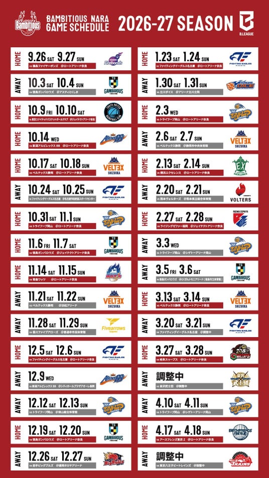 りそなグループ B.LEAGUE 2026-27シーズンのバンビシャス奈良ホーム開幕戦のカードが決定!