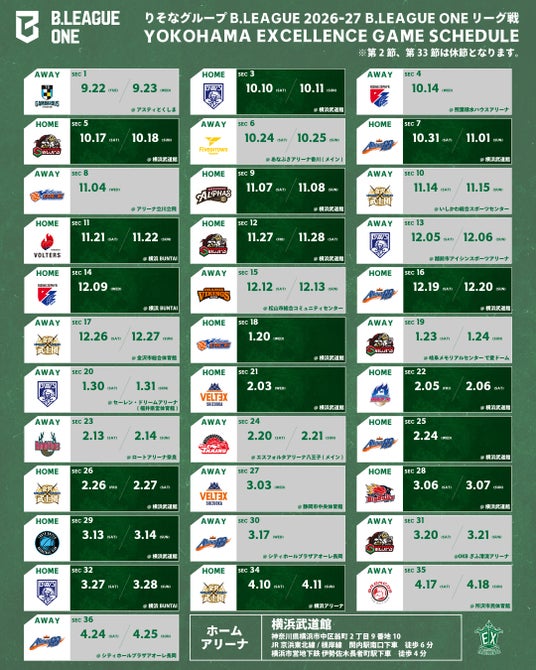 横浜エクセレンス「りそなグループ B.LEAGUE 2026-27 B.LEAGUE ONE リーグ戦」 試合日程