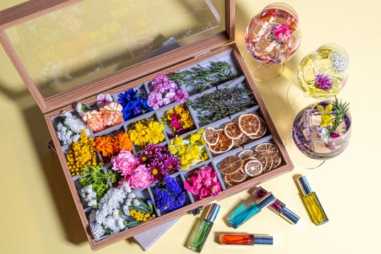 「グラスフラワーアレンジメント」1,000円(税込):コーディアルシロップをベースに、エディブルフラワーやハーブ、ドライフルーツを各自選んでいただき、花の香りをスプレーして仕上げるオリジナルドリンク。