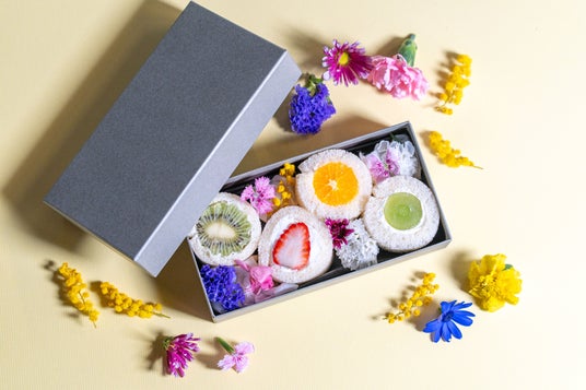 「フルーツロールBOX」800円(税込):ギフトボックスに詰め合わせた、4種のフルーツロールサンド。キウイ、いちご、ぶどう、オレンジで花を表現し、クリームには花のフレーバーを加えました。