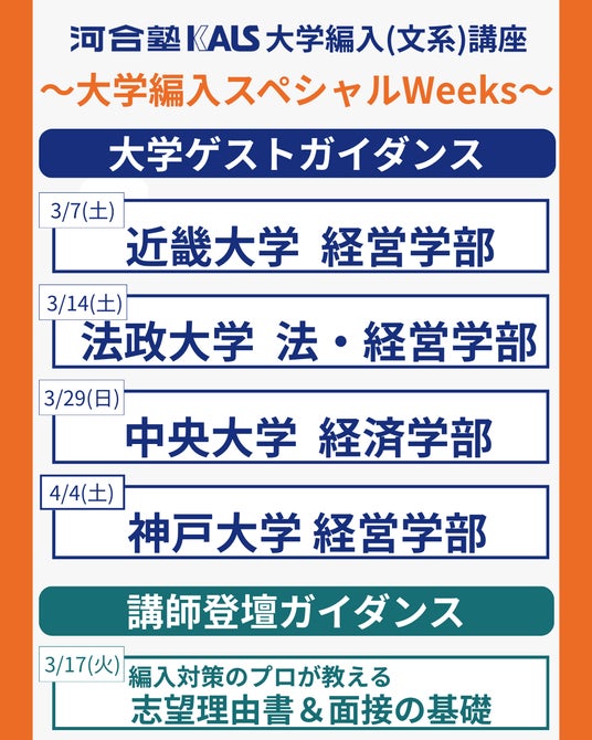 河合塾グループの株式会社KEIアドバンスが運営する予備校「河合塾KALS」新宿本校・新大阪校は、 大学編入試験の受験を検討される方を対象に、東西の人気4大学の担当者をお招きした特別ガイダンス 企画「大学編入スペシャルWeeks」を3月7日(土)から5週連続で開催します。