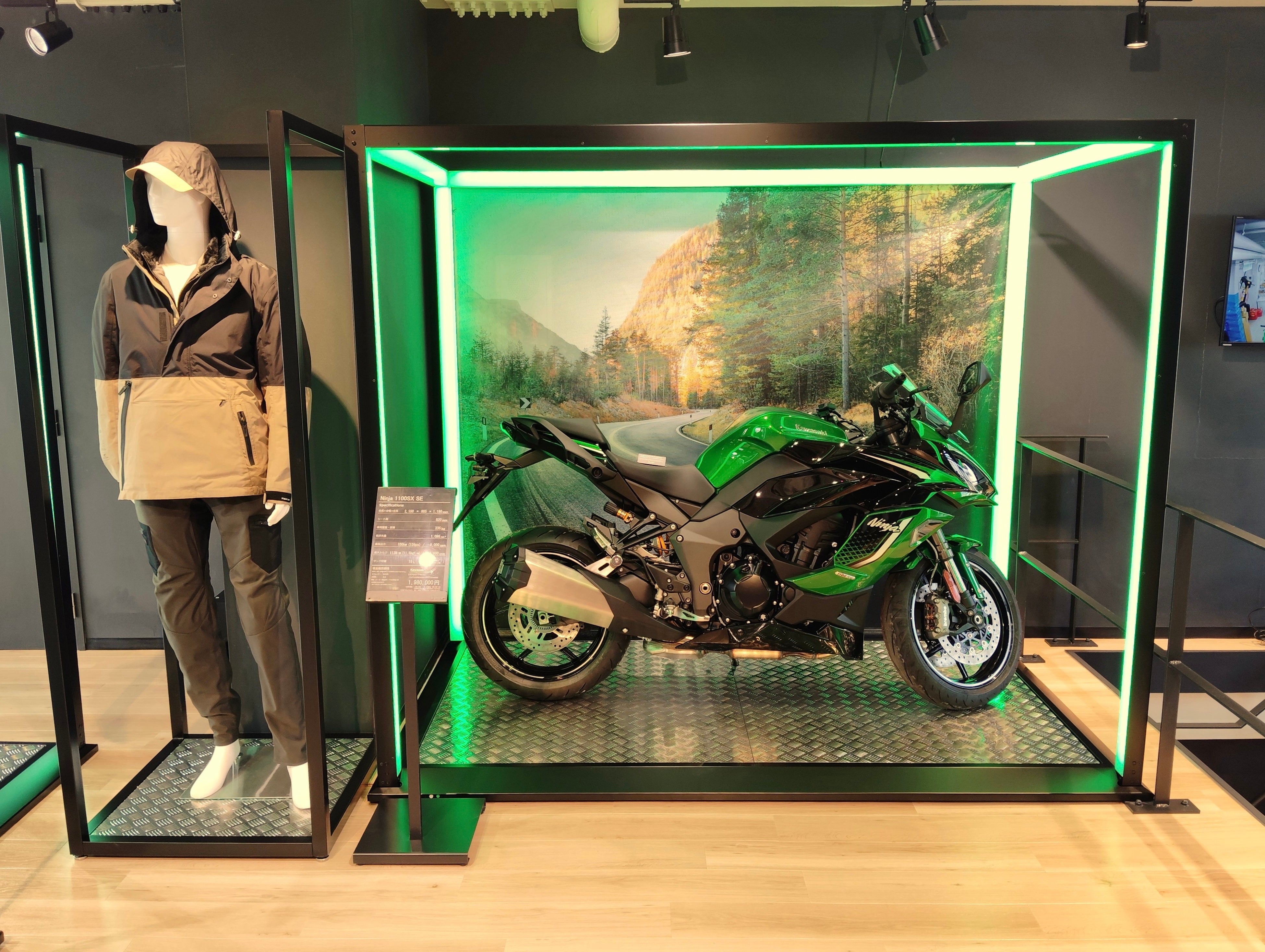 新たなオーナーを待つモーターサイクルたちが、ケージの中で静かに眠りについているイメージを光の枠で創出。カワサキプラザならではのアイコニックポイントの一つです。
