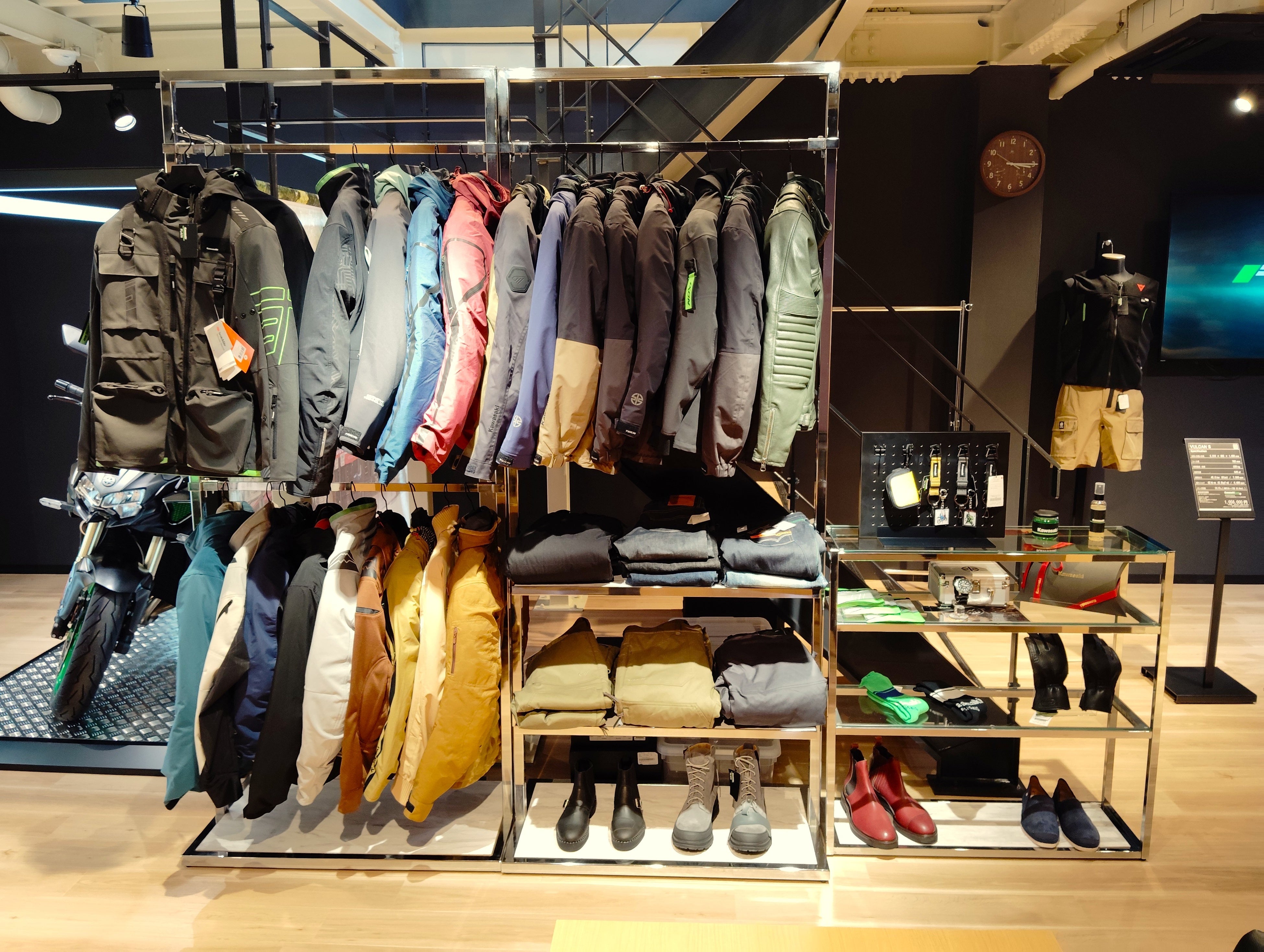 木目調のフロアと白い天井が織りなす明るい店内。モーターサイクルとプラザアパレルがゆったりと展示され、どなたでも楽しめる空間となっています。
