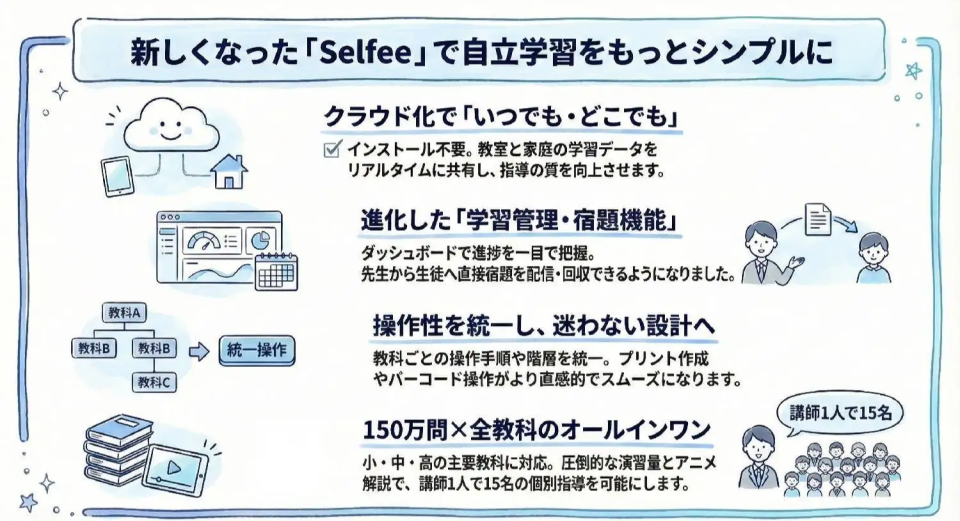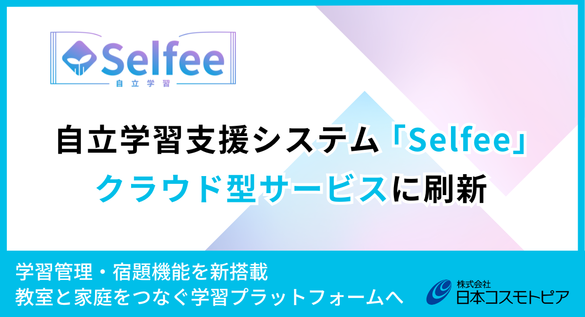 株式会社日本コスモトピア(本社:大阪府大阪市中央区 、代表取締役社長: 尾上 幸裕 、以下 日本コスモトピア)は、全国の学習塾・教室向け自立学習支援教材システム「Selfee(セルフィー)」を従来のPCごとのインストール型からWebブラウザで利用できるクラウド型サービスへ刷新し、学習管理機能および宿題機能を新たに搭載した新バージョンの提供を2026年3月5日(木)より開始いたします。
