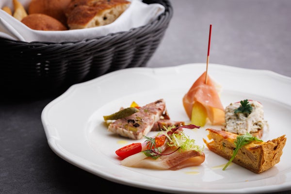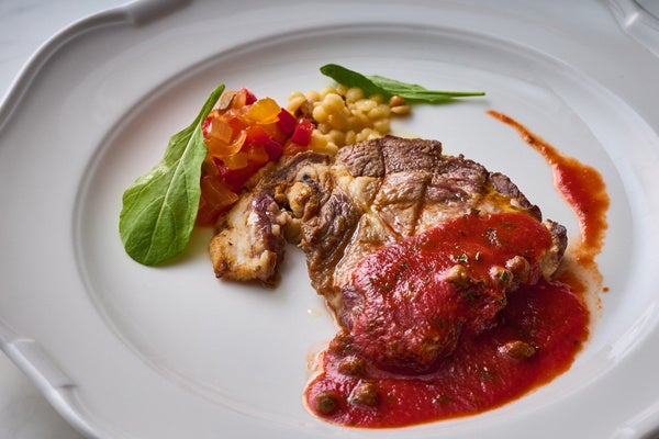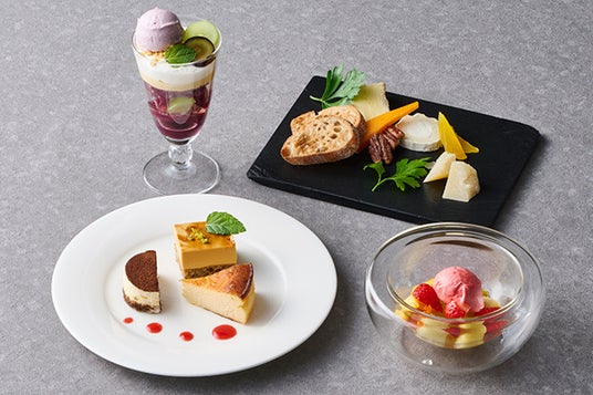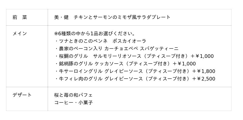 ケールや低カリウムレタス、根菜、山菜、ハーブに、蒸し鶏、サーモンを合わせた具だくさんプレートは、春の花畑をイメージして彩り華やかに仕上げました。自家製の野菜すりおろしドレッシングでお召し上がりいただく体に優しい一品です。メインは6種類の中からその日の気分でお好きなものをお選びいただけます。魚料理では、旬の“桜鯛”をグリルにし、ふっくらしっとりとした身と皮目のパリッとした食感をお楽しみいただけます。素材の旨みがより引き立つレモンとオリーブオイルをベースにした爽やかなソースでご賞味ください。肉料理は3種類ご用意し、豚肉は相性のよいトマトソースで、牛サーロインと牛フィレ肉は旨みが凝縮された濃厚なグレイビーソースでご堪能いただけます。締めくくりは、旬の苺と抹茶や和三盆など和のエッセンスを合わせ、アクセントにジュレやソース、アイスクリームに桜を取り入れた、春らしさを感じるこの時期ならではのパフェをご賞味ください。