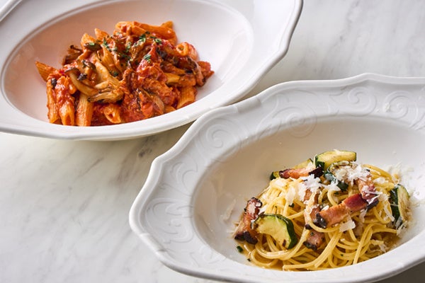 ツナときのこのペンネ ボスカイオーラ/農家のベーコン入り カーチョエペペ スパゲッティーニ