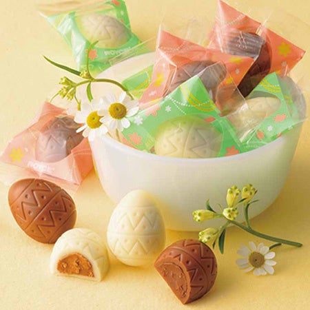 イースターのモチーフをデザインした限定ボックスに、卵の形をしたひと口サイズのチョコレートを詰め合わせました。ココア風味のクリームをミルクチョコレートに閉じ込めた[ミルクショコラ]と、アーモンドプラリネのクリームをホワイトチョコレートに閉じ込めた[ホワイトショコラ]の2種類の味わいです。食感の良いクッキークランチがアクセントになっています。
