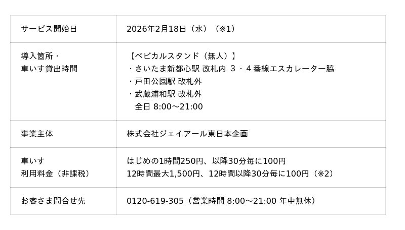 〇この度、お客さまサービスのさらなる向上とお出かけ機会の拡大につなげるべく、すでにベビーカーの貸出箇所であるさいたま新都心駅、戸田公園駅、武蔵浦和駅の3駅において、予約ができ駅から外へ持ち出せる車いすのレンタルサービスとして「車いすレンタルサービスbyベビカル」を2月18日より開始します。