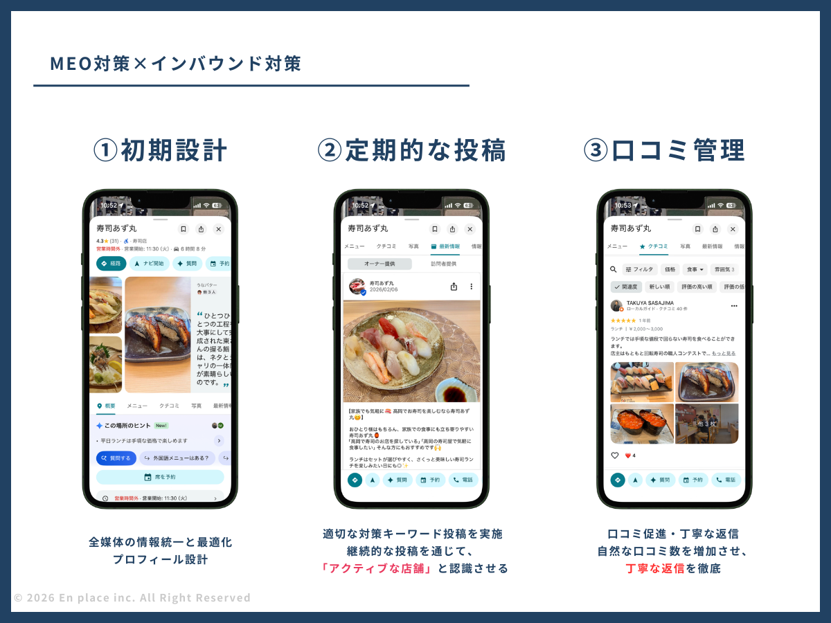 対象寿司店15店舗に対してMEO対策を実施します。
