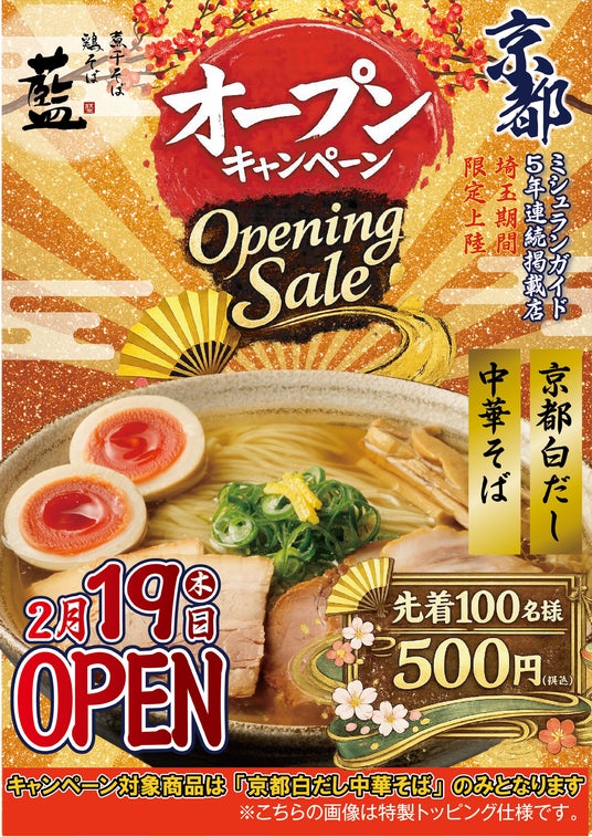 オープンを記念して、2026年2月19日(木)のオープン当日は、先着100名様に「京都白だし中華そば」を500円でご提供いたします!この機会に是非京都のだしをご賞味ください。