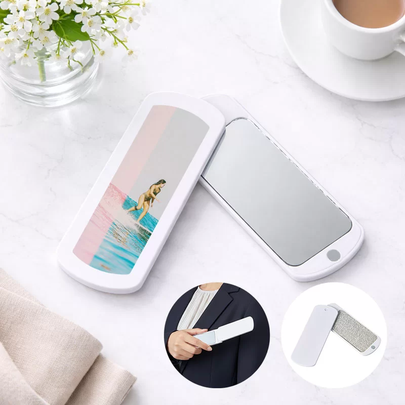 外出先でもスマートに身だしなみチェック!洋服クリーナーとミラーが一体化した2WAY仕様の携帯用クリーナーを1個からオリジナル作成。