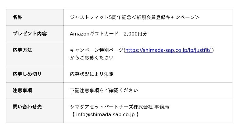 シマダアセットパートナーズ株式会社(本社:東京都渋谷区、代表取締役社長:佐藤 悌章)はこの度、不動産小口化商品「ジャストフィット」が5周年を迎えることを記念し、新たに投資家登録をいただいた方全員に期間限定でAmazonギフトカードのプレゼントキャンペーンを行います。