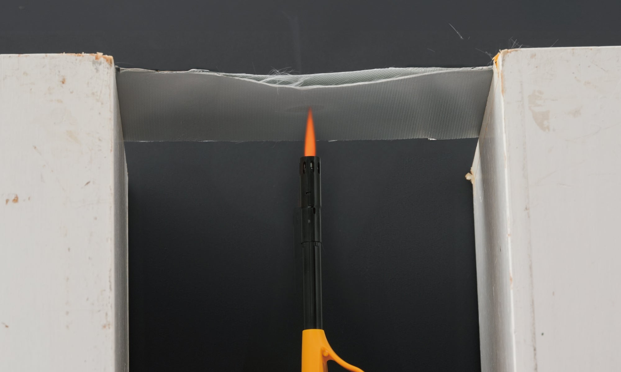 モバイルバッテリーが発火したことを想定し、表側生地と内側生地2枚を重ねた状態で内側のみにターボライターの火(約1200℃~1400℃)をあてて、燃えないか自社でテストしてみました。