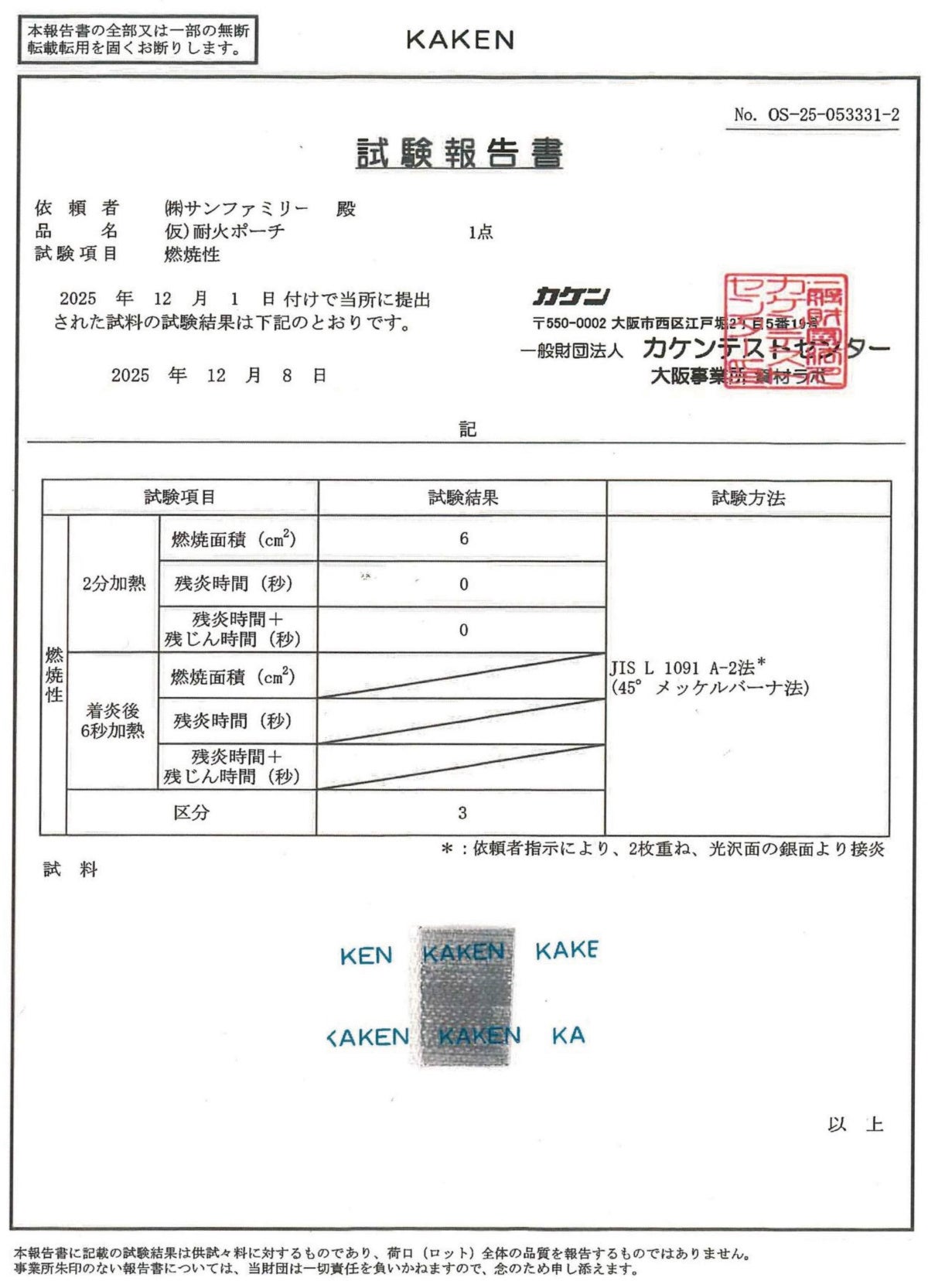 ・素材について第三者機関(一般財団法人カケンテストセンター)で試験をし、燃焼試験区分「3」クリアを確認