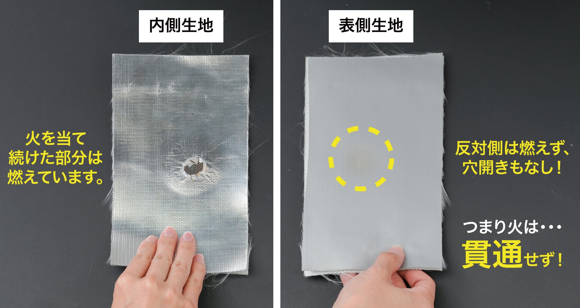 1200℃以上の火を1分以上当て続けた側は、その部分だけが燃えたが、反対側は燃えませんでした。そして穴あきや破れなどもなかったため、強い火力でも"炎が貫通しない"ことが自社テストにより証明されました。