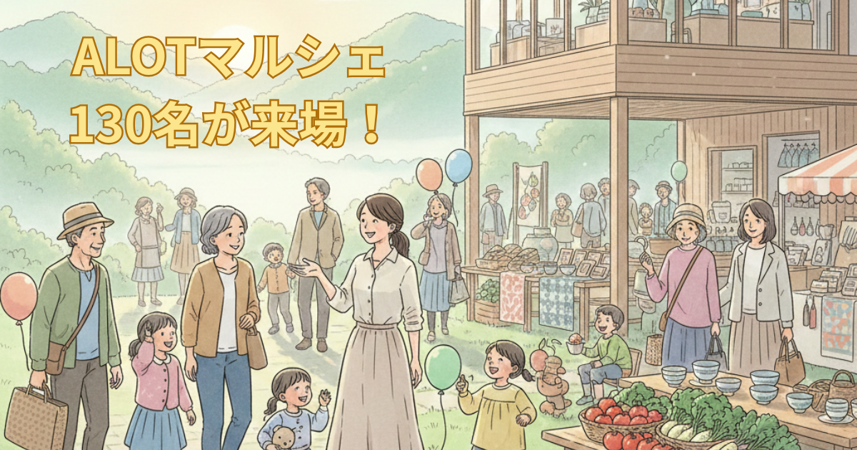 会場となった「ALOT(アロット)」は、熊本県あさぎり町が運営するテレワーク施設です。「リフレッシュとインスピレーションが生まれる場所」をコンセプトに、朝霧に包まれた美しい風景や田園風景に囲まれながら働ける環境が整っています。今回のマルシェでは、屋内の交流スペースを効果的に活用し、出店者と来場者の物理的な距離を縮める「密度のデザイン」を意識しました。その結果、会話が弾む温かな雰囲気が生まれ、中には大規模マルシェを上回る売上を記録する出店者も現れるなど、高い満足度を実現しました。