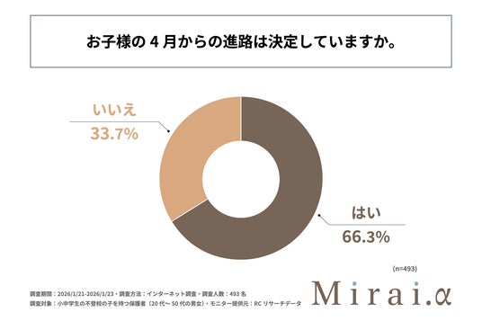合同会社Mirai.y(本社:東京都目黒区、代表社員:丸林 友美)が運営する「Mirai.α」は、小中学生の不登校の子を持つ保護者(20代~50代の男女)を対象に「小中学生の不登校の子を持つ保護者が考える、子どもの4月からの進路に関する調査」を実施しました。この調査から、小中学生の不登校の子を持つ保護者の、子どもの4月からの進路に関する決定状況やその決め方、情報収集における実態や課題などが明らかになりました。
