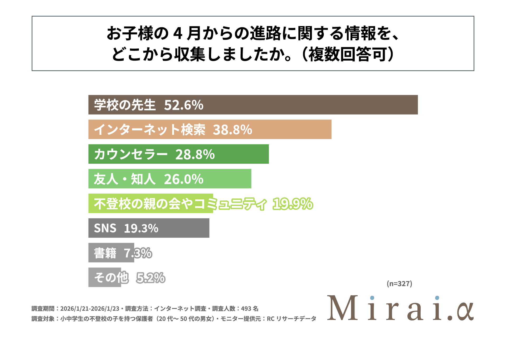 次に、不登校の子どもの4月からの進路が決定していると回答した人を対象に「子どもの4月からの進路に関する情報を、どこから収集したか」を尋ねる設問への回答では、1位が「学校の先生」で52.6%、2位が「インターネット検索」で38.8%、3位が「カウンセラー」で28.8%という結果になりました。この結果から、不登校の子どもの4月からの進路が決定していると回答した人の半数以上が、子どもの4月からの進路に関する情報を「学校の先生」から収集したことが明らかになりました。