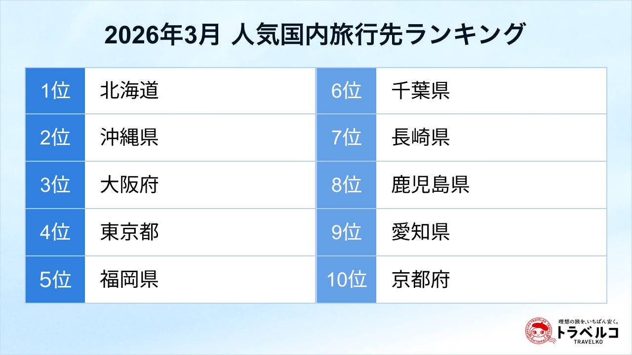 3月の人気国内旅行先ランキングでは、海鮮グルメが充実する「北海道」が1位。3月でも、冬のアクティビティを快適に楽しめる点が魅力です。続く2位には一足早く海開きを迎える「沖縄県」、3位にはテーマパークやグルメが人気の「大阪府」がランクインしました。