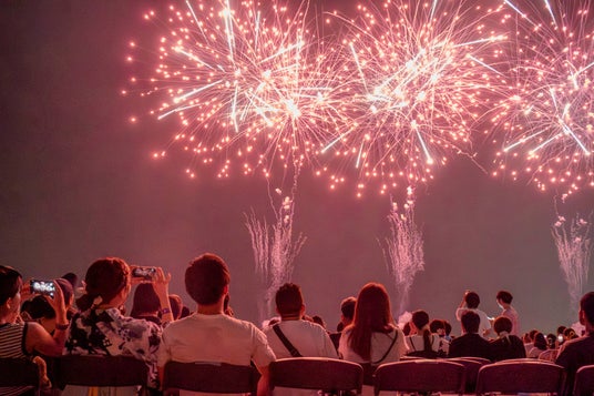 空いっぱいに広がる花火のスケール感と音響の調和をバランスよく楽しめるパイプ椅子席。少し距離を置くことで、花火の広がりをワイドに体感できる視界の開けたエリアです。