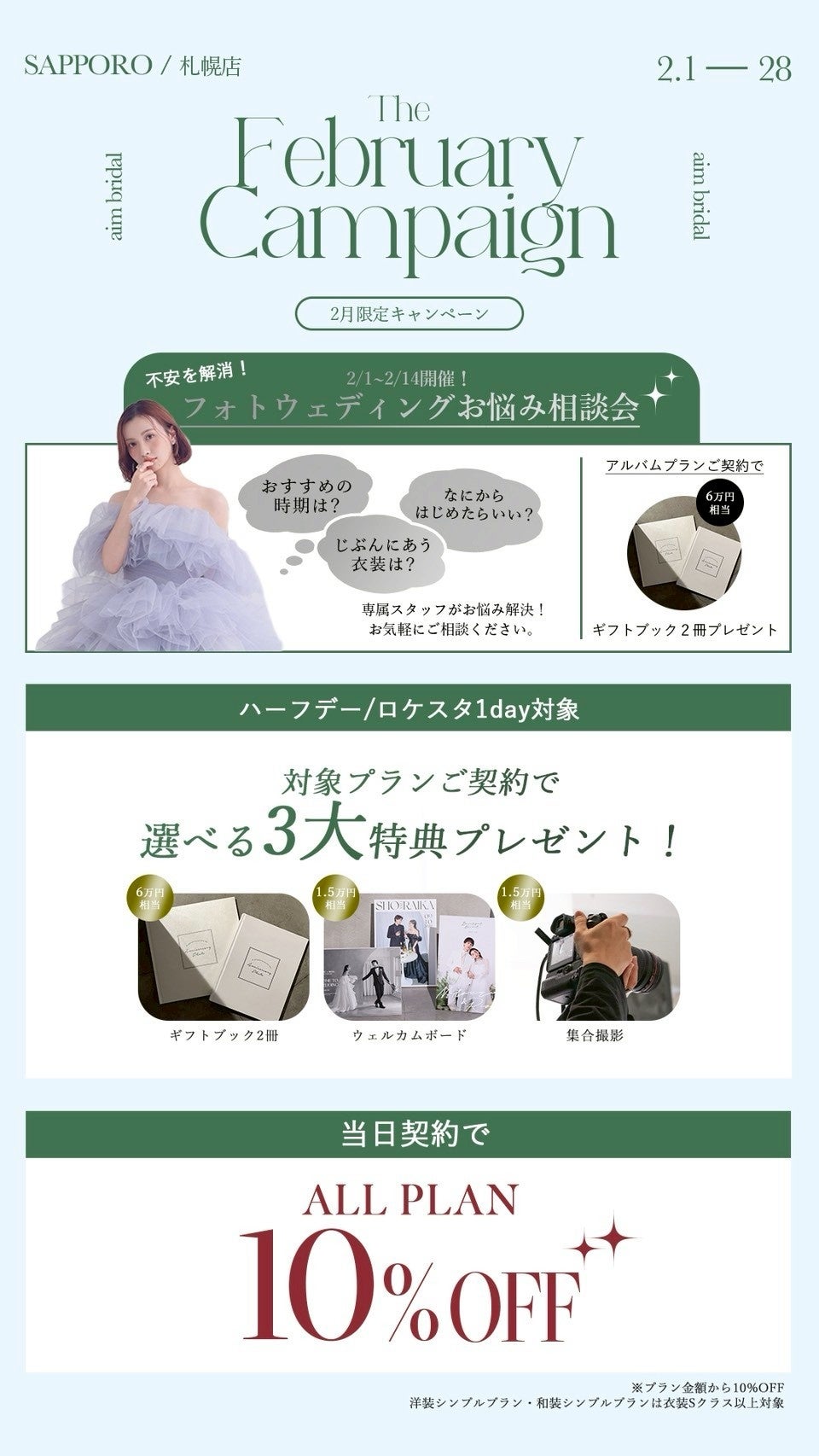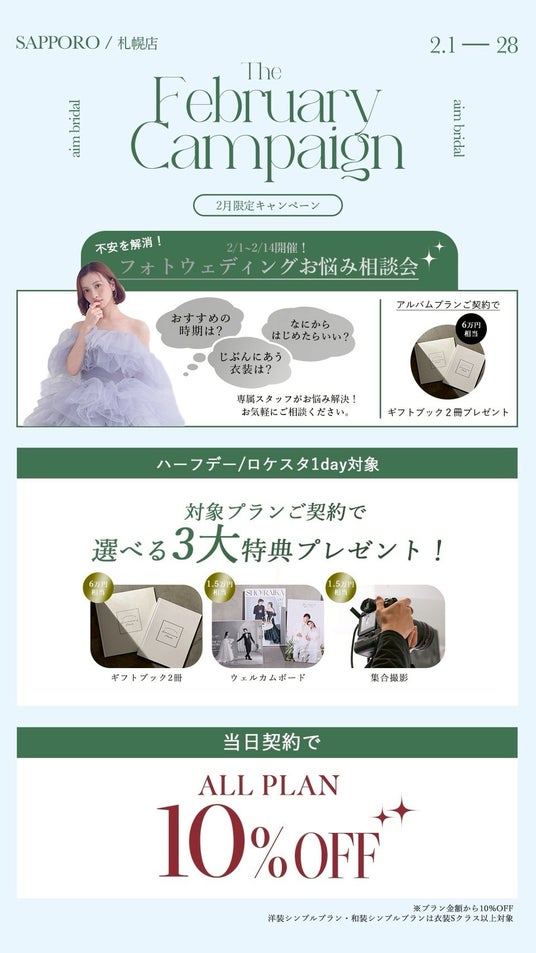 北海道札幌市のウエディングフォトスタジオ、aim札幌店の2月のキャンペーン情報をお届けいたします!フォトウェディングの際のお得情報やソロウェディングキャンペーンもご紹介をしております。