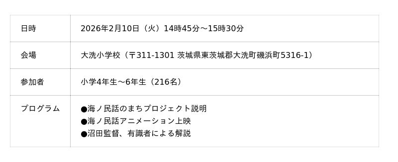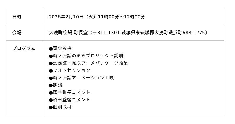 一般社団法人日本昔ばなし協会が取り組む「海ノ民話のまちプロジェクト」は、2026年2月10日(火)に茨城県大洗町を舞台にした海ノ民話アニメーション「織姫塚」が完成したため、アニメ監督が大洗町を訪問しアニメのお披露目と「海ノ民話のまち」認定式を実施しました。