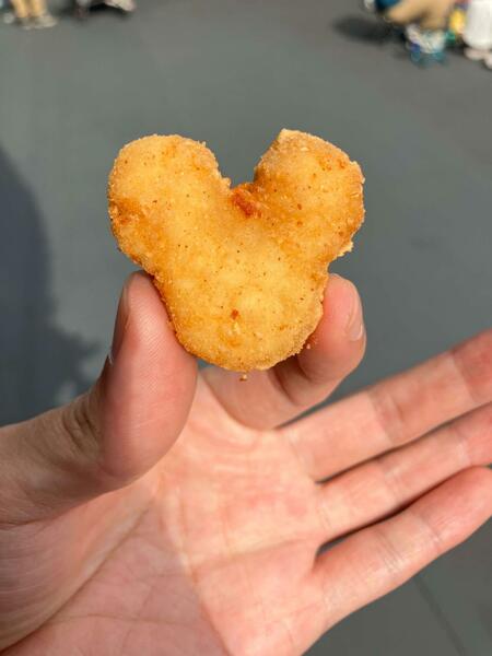 サクッと揚がったチキンナゲットは、安定のおいしさ。可愛いミッキー型のナゲットが5個入ってお値段は400円。小腹が空いたときにつまむのに便利なお手軽感がいいですね。