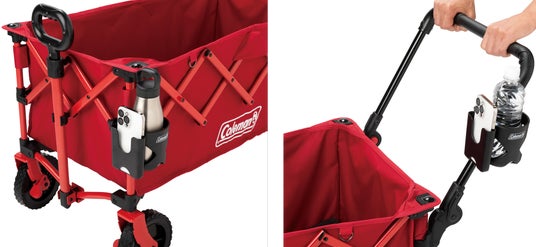 「カップホルダー」は、チェアだけでなく、コールマンの「アウトドアワゴン」シリーズ各種のフレームや、ワゴンのフレームに取り付けて楽な移動を可能にする「アウトドアワゴンプッシュハンドル」にも直接付けて使用することができます。